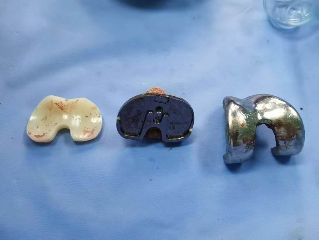 在老人家入院3天后,查振刚教授和张还添教授与麻醉、手术、护理团队协作,以沉稳熟练的操作,一步步解开首次手术留下的难题。团队小心翼翼地取出旧假体,仔细清理关节腔,评估并处理了关节周围的骨质情况,并通过严格规范的方法排除了感染。随后,凭借对膝关节三维立体解剖和生物力学的深刻理解,查教授和张教授精准植入了一套全新的膝关节翻修假体。手术过程如行云流水,不仅成功矫正了关节力线,完美实现了膝关节的伸直与屈曲平衡,更确保了假体的坚固稳定。